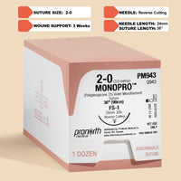 • A display featuring a box and an individual pack of 2-0 MONOPRO Violet 36" FS-1 Needle sutures. The box is marked with the product reference PM943 and details the suture's specifications, such as size, length, and needle type. The packaging underlines its absorbable nature and suitability for veterinary use, highlighting MONOPRO's role in delivering high-quality suture materials for surgical precision and patient care.
