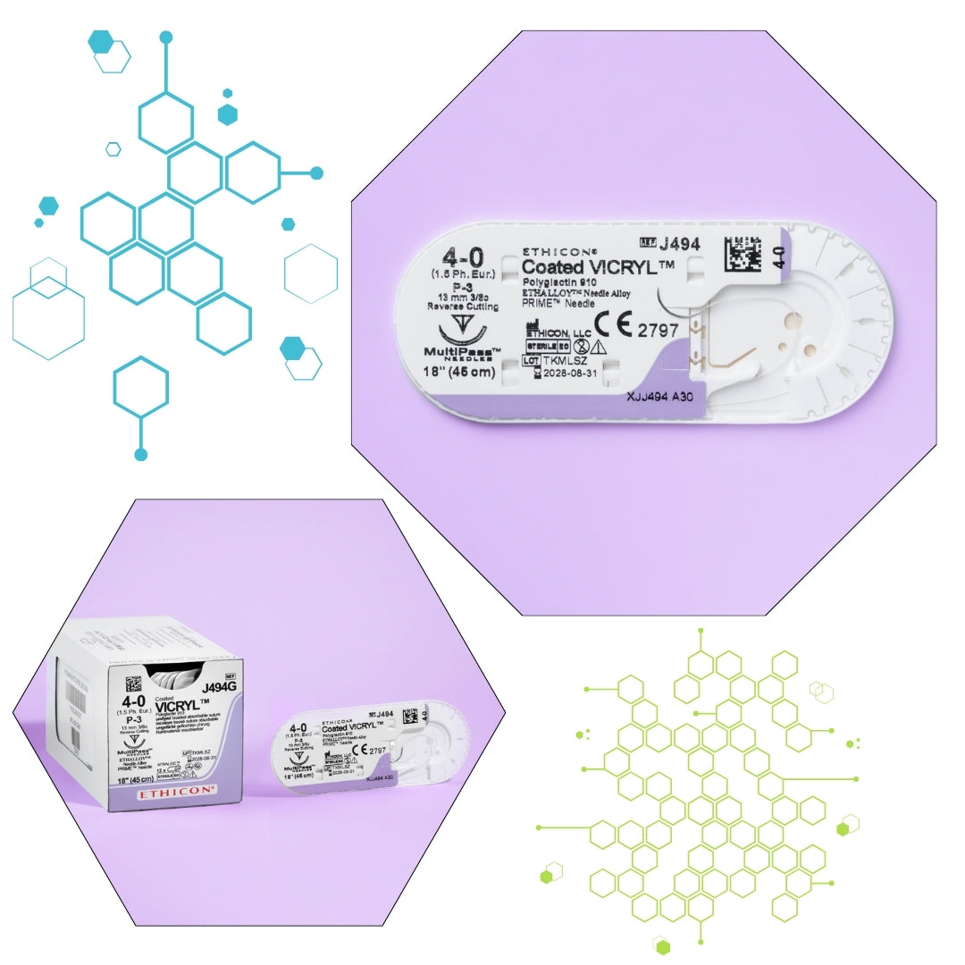 • Image of COATED VICRYL® 4-0 Undyed Sutures, model J494G, displaying the sutures equipped with a 13mm P-3 prime reverse cutting needle. The visual emphasizes the suture's role in precise surgical procedures, highlighting its absorbable nature and engineered design for enhanced patient recovery and surgical success.