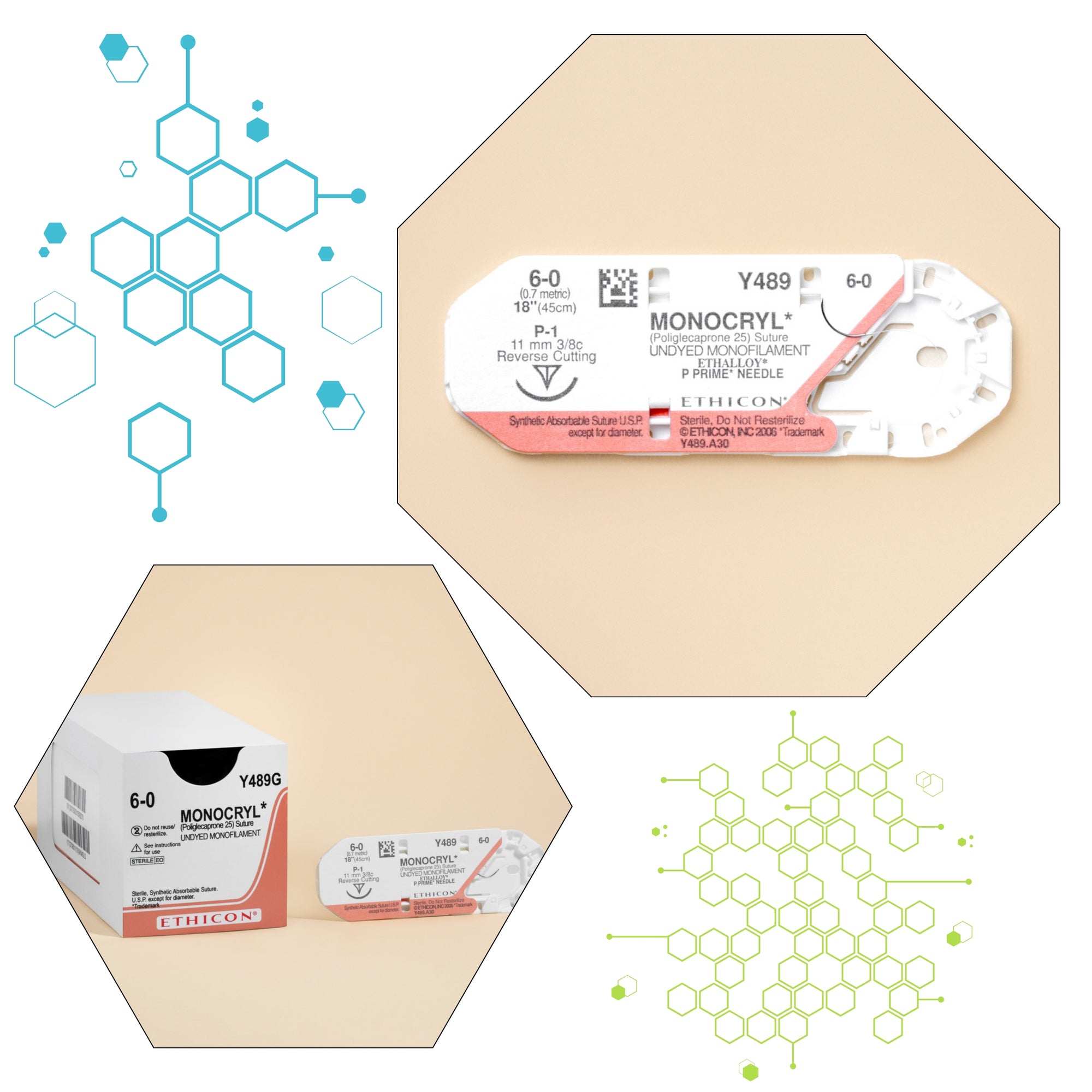 • Ethicon 6-0 MONOCRYL® Undyed Sutures, product code Y489G, featuring a fine gauge and a sharp 11mm P-1 reverse cutting needle. The suture's undyed material and absorbable qualities are highlighted, catering to surgeries where natural appearance and rapid healing are prioritized.