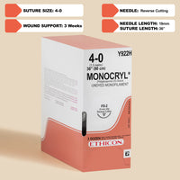 • Box of Ethicon 4-0 MONOCRYL® Violet Sutures, item Y922H, showcasing a long 36-inch suture paired with a 19mm FS-2 reverse cutting needle. The suture's vibrant violet color and absorbable nature are emphasized, designed for effective and precise wound closure in an array of surgical procedures.