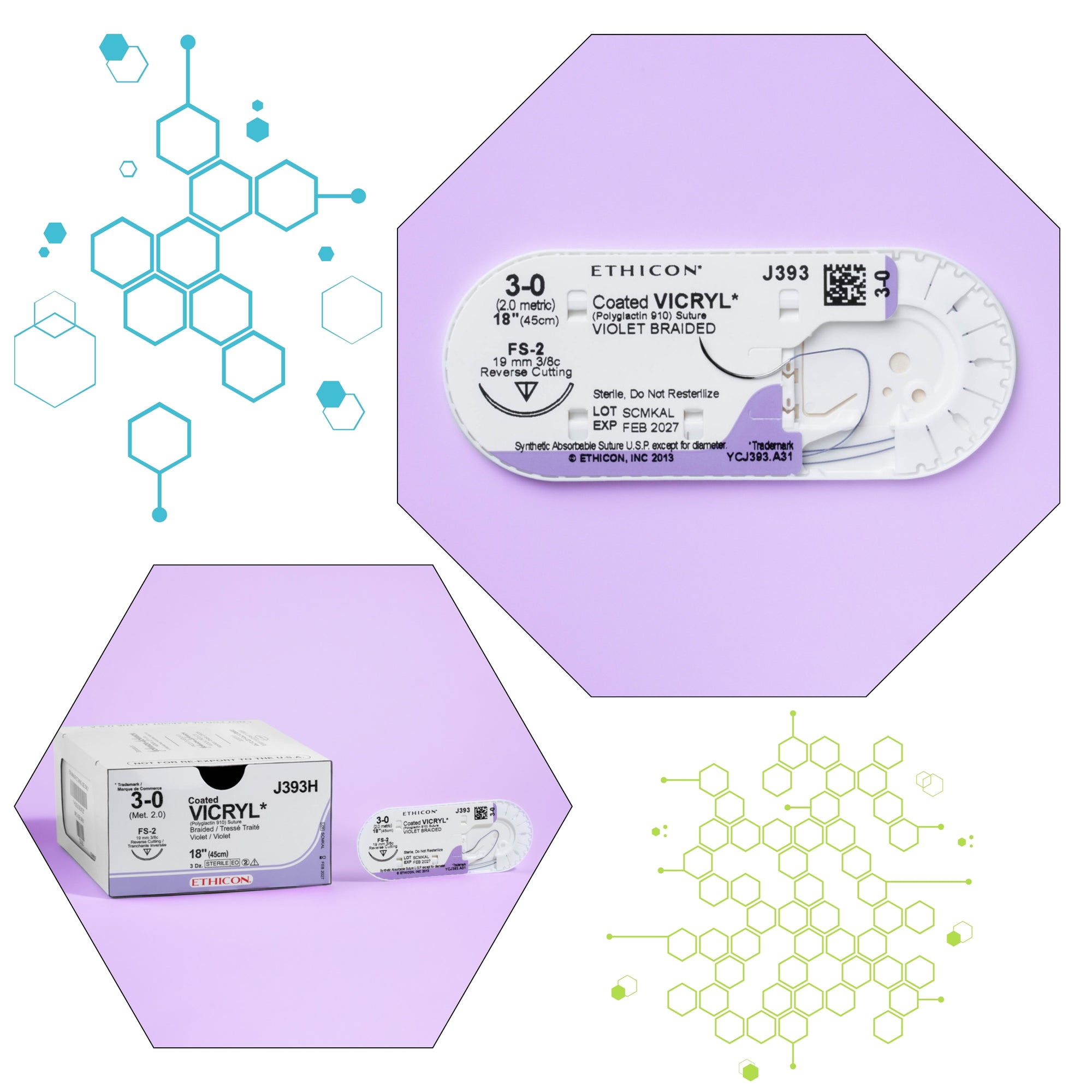 • COATED VICRYL® 4-0 Violet Sutures, model J392H, featuring medium-gauge, violet-colored threads linked to a 19mm FS-2 reverse cutting needle. Designed for a wide range of surgical applications needing precise tissue approximation and minimal scarring, this package of 36 sutures meets the high demands of healthcare professionals