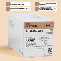 • Box of 6-0 Chromic Gut sutures with a C1 precision reverse cutting needle, model 1242B, emphasizing the 2-week wound support duration and featuring a QR code for easy reference. The packaging highlights its sterility and absorbable nature tailored for delicate surgical procedures.