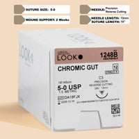 • Box of 5-0 Chromic Gut sutures with a C-3 precision reverse cutting needle, model 1248B, highlighting the 2-week wound support and featuring a QR code for quick scanning. The package underlines sterility and the absorbable nature of the sutures for effective wound care management.