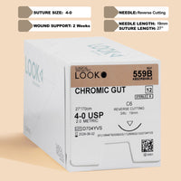•  Box of 4-0 Chromic Gut sutures with a C-6 reverse cutting needle, model 559B, highlighting the two-week wound support capability and featuring a QR code for quick scanning. The sterile packaging ensures safety and reliability for surgical procedures.
