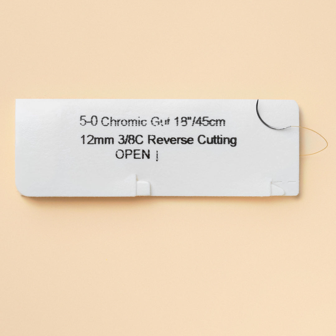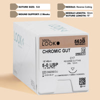 • Box of 5-0 Chromic Gut sutures with a C-17 reverse cutting needle, model 563B, emphasizing the 2-week wound support duration and featuring a QR code for easy reference. The packaging highlights its sterility and absorbable nature tailored for effective wound management.