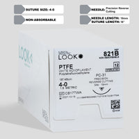 • Image showing a box and individual package of 4-0 PTFE white sutures with an 18-inch PC-31 precision reverse cutting needle. The box is labeled with the reference number 821B, indicating the non-absorbable nature of the sutures, and includes a QR code for easy access to detailed product information. The sutures are designed for use in periodontal and dental surgery where prolonged suture support is required.