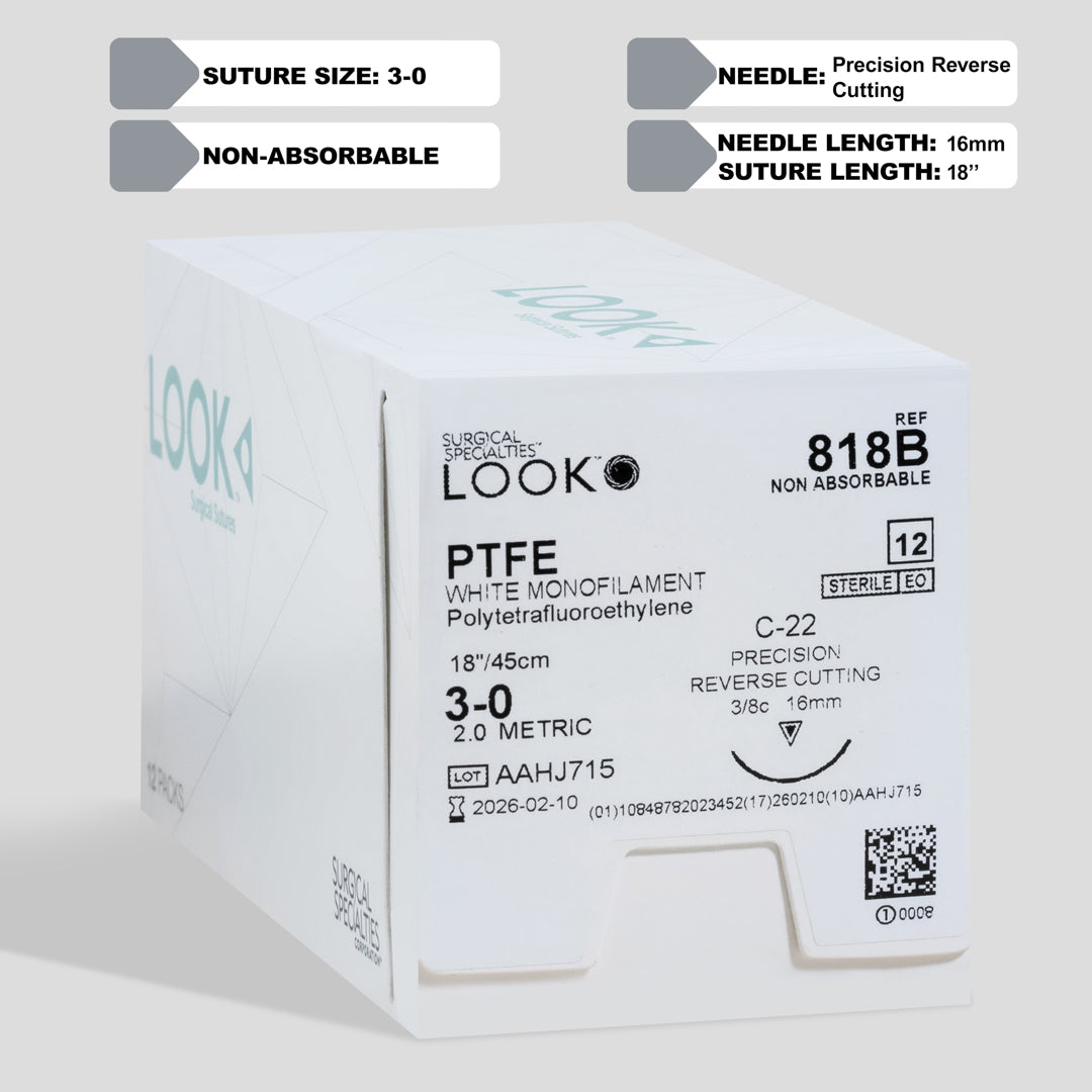 The 3-0 PTFE suture with an 18-inch C-22 precision reverse cutting needle, product code 818B, is an ideal choice for periodontists seeking reliable and inert suture material for dental surgeries. Its non-reactive nature and ease of use make it a mainstay for intricate periodontal procedures.