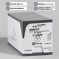 • An image showcasing a box of 4-0 PTFE MONOTEX 24" FS-3 Cobra Black sutures. The packaging highlights the suture's specifications, including the unique FS-3 Cobra Black needle and the PTFE white monofilament thread, emphasizing its non-absorbable nature and specialized application in surgical procedures. The box also features the reference number T8001C, underscoring its quality and reliability for professional use.