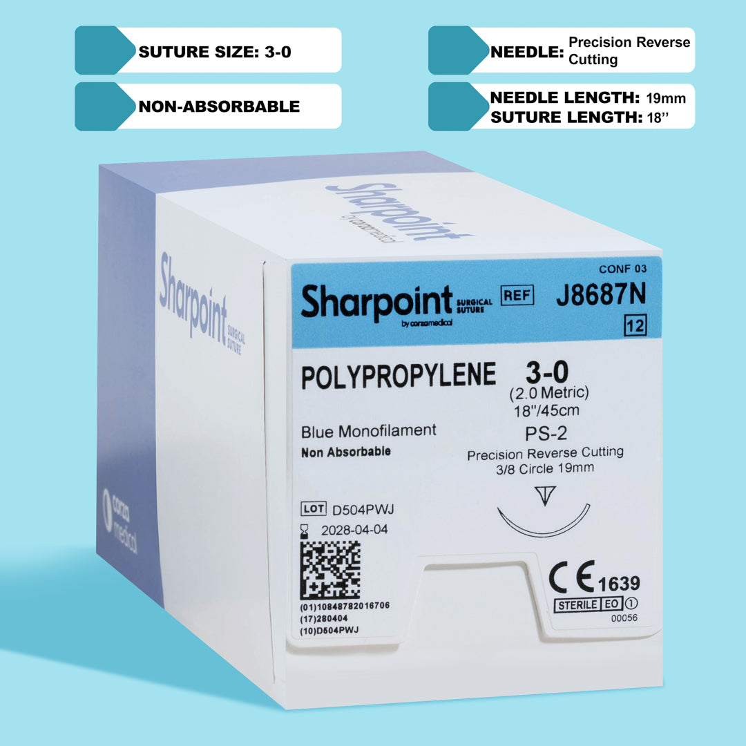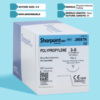 • Sharpoint 3-0 blue polypropylene suture (J8687N) with an 18-inch length and a PS-2 precision reverse cutting needle. This non-absorbable, monofilament suture is packaged for sterility, highlighted for its use in medical disciplines requiring precise tissue approximation and long-term support. The box showcases its use in advanced surgical procedures, making it a trusted choice for healthcare professionals across various specialties