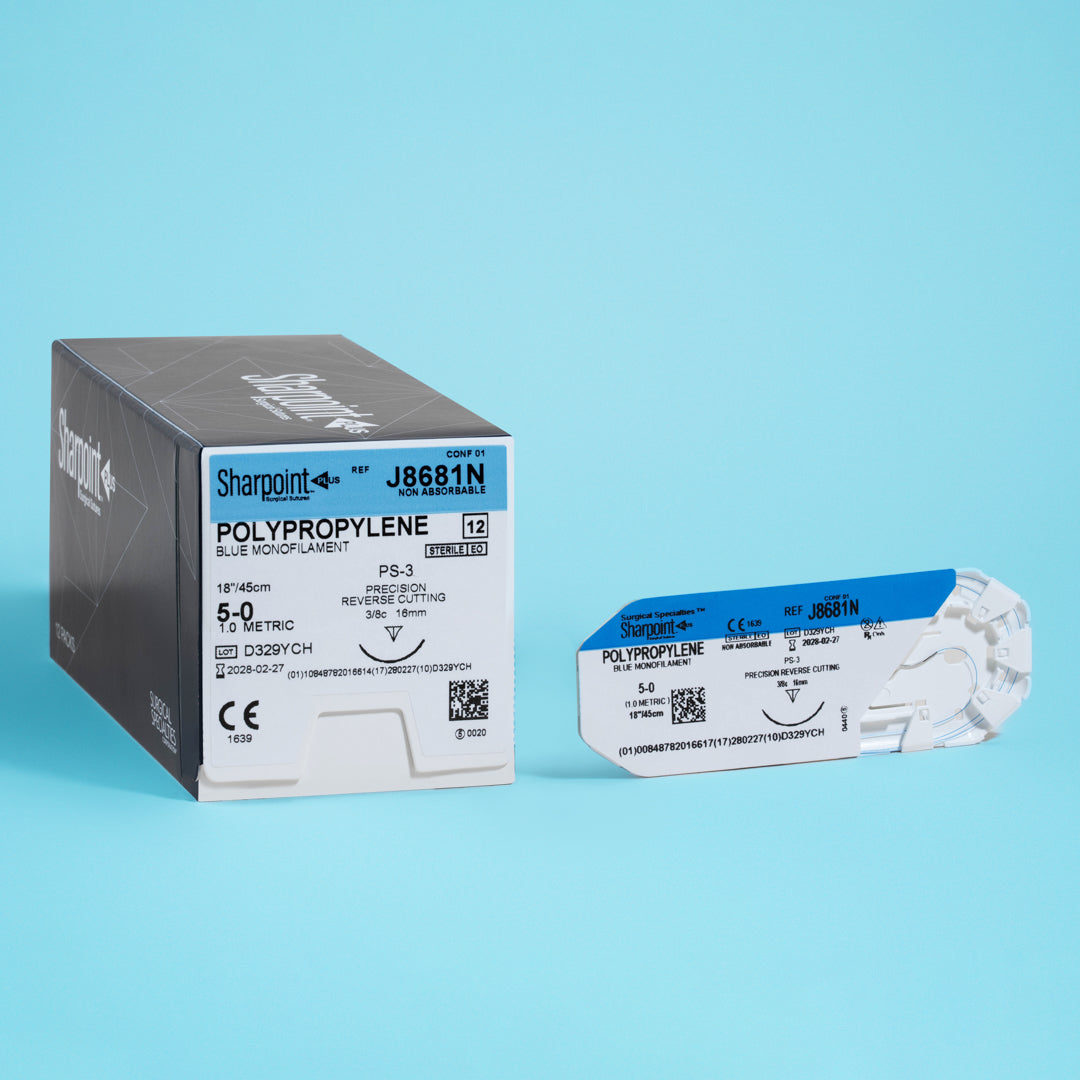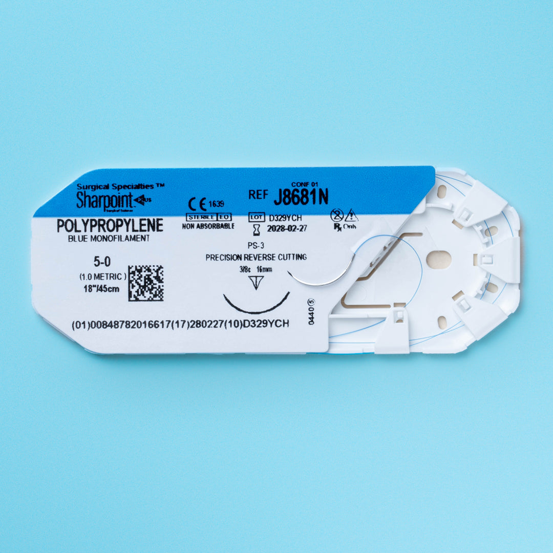 The Sharpoint Polypropylene 5-0 suture with a PS-3 precision reverse cutting needle (J8681N) combines the critical elements of surgical performance: strength, handling, and safety. Designed for the discerning needs of plastic surgeons, dermatologists, and other specialists requiring meticulous suturing, it excels in procedures where precision is non-negotiable. This suture stands out for its blend of visibility, control, and reduced tissue reaction, making it a preferred choice for enhancing patient outcomes in aesthetic and reconstructive surgeries.
