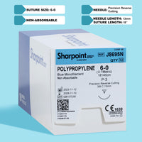 • A box and suture packet of Sharpoint 6-0 blue polypropylene suture (J8695N), featuring a P-3 precision reverse cutting needle for exact suturing. This non-absorbable monofilament suture is designed for high-precision surgical procedures, offering lasting support and minimal tissue reaction. It's showcased as a key tool for professionals in specialized surgeries, emphasizing its quality and reliability