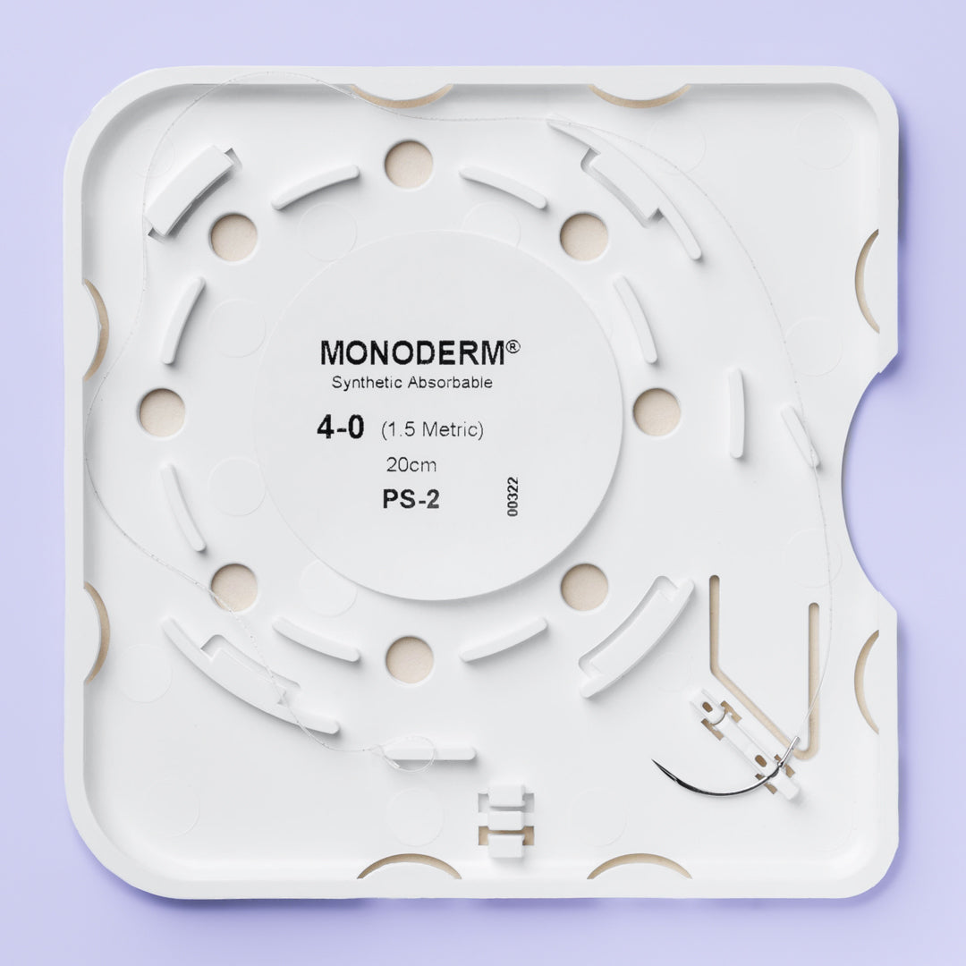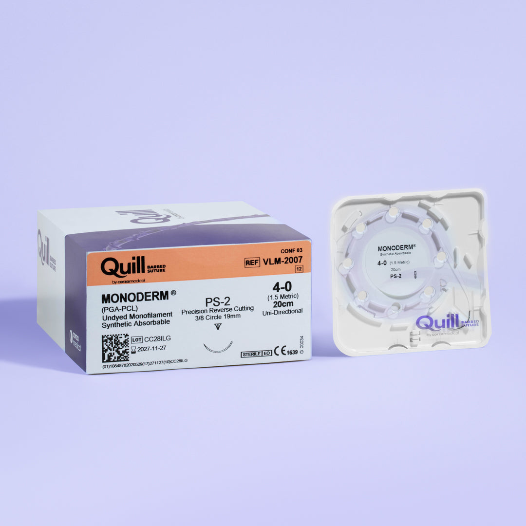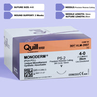 • A box of Quill Monoderm 4-0 barbed sutures, with a purple and orange design, labeled for wound support up to 3 weeks. The suture is made from undyed PGA-PCL monofilament material and comes with a 19mm PS-2 precision reverse cutting needle. The box indicates a suture length of 20cm and provides a lot number and sterilization information.